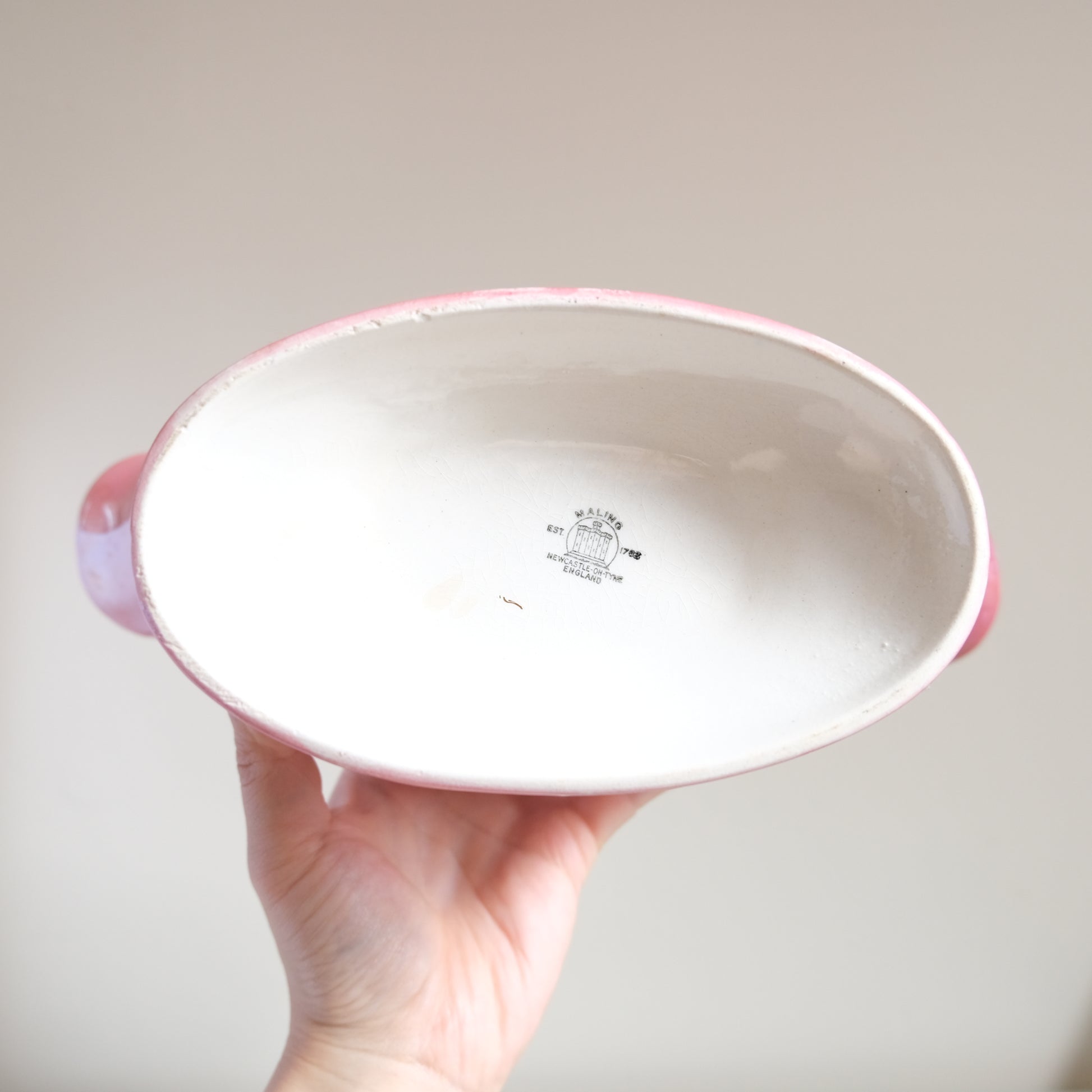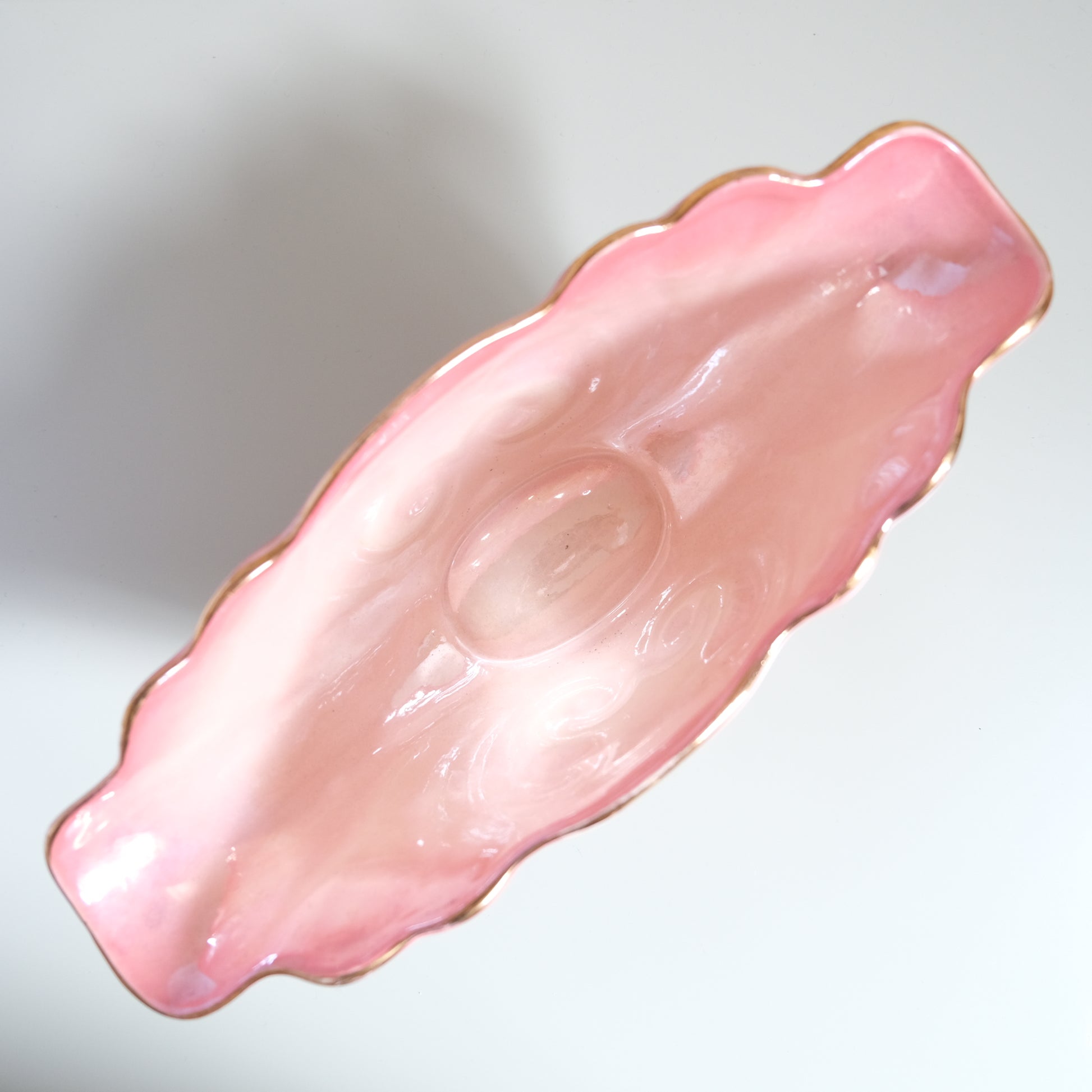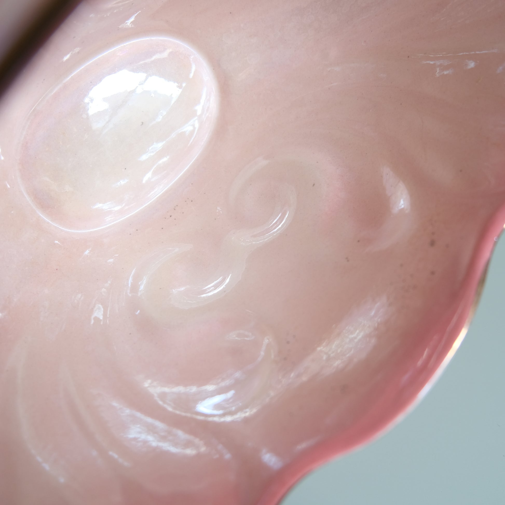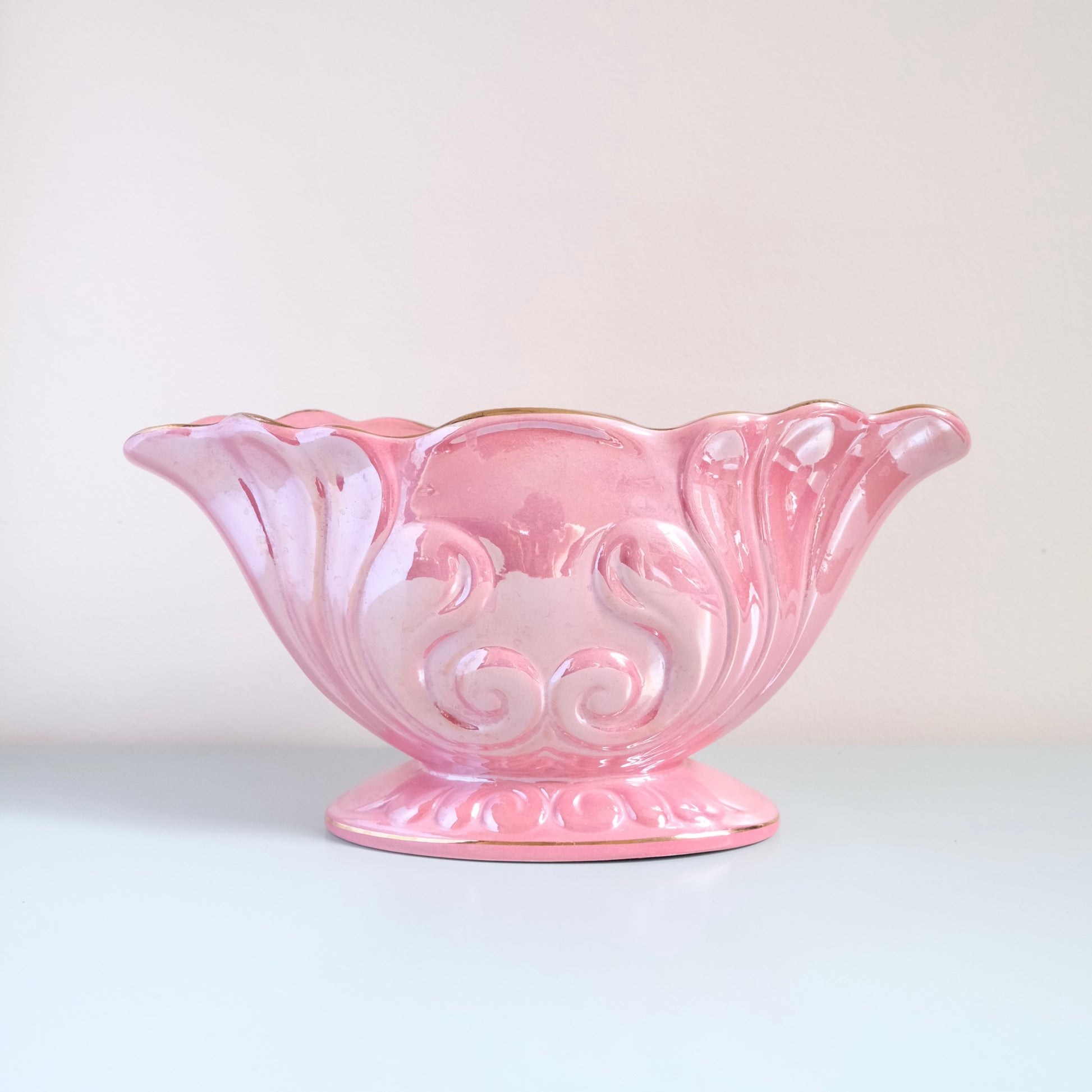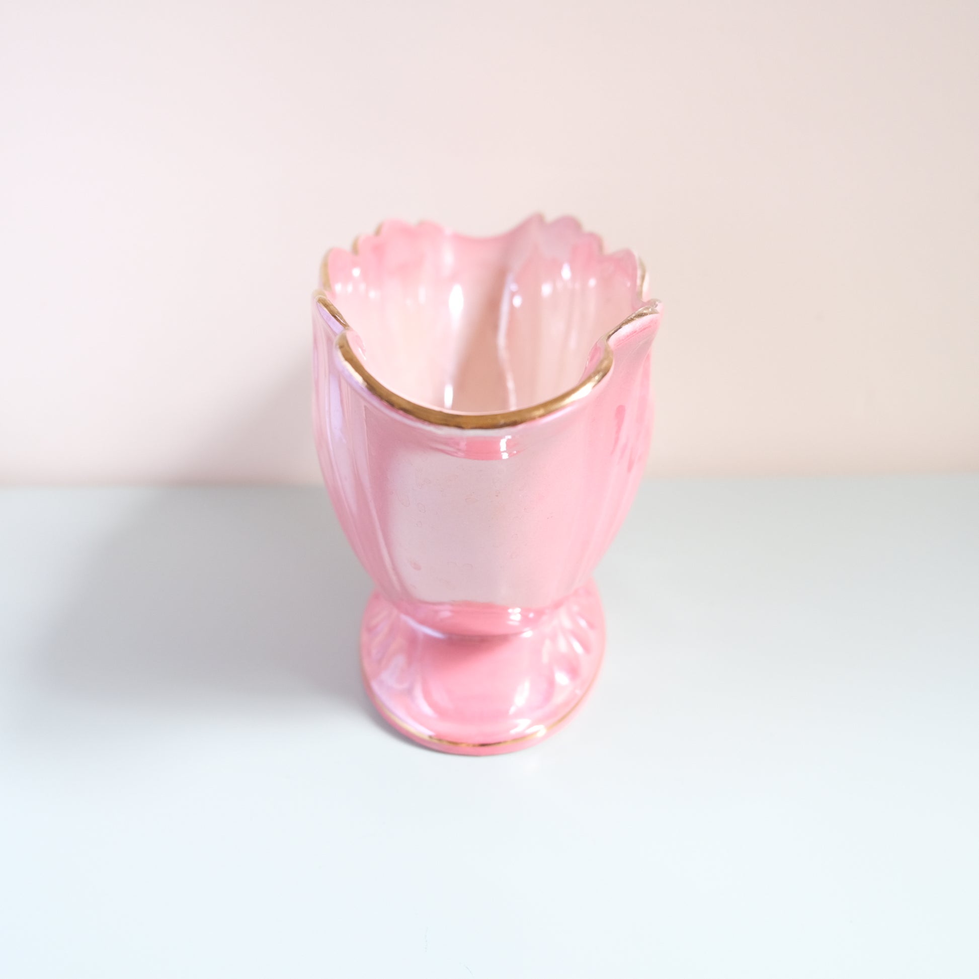 Featuring a glossy pink glaze with iridescent shine and elegant gold detailing, its elongated shape was originally designed to sit atop a fireplace mantel as a decorative flower vessel.