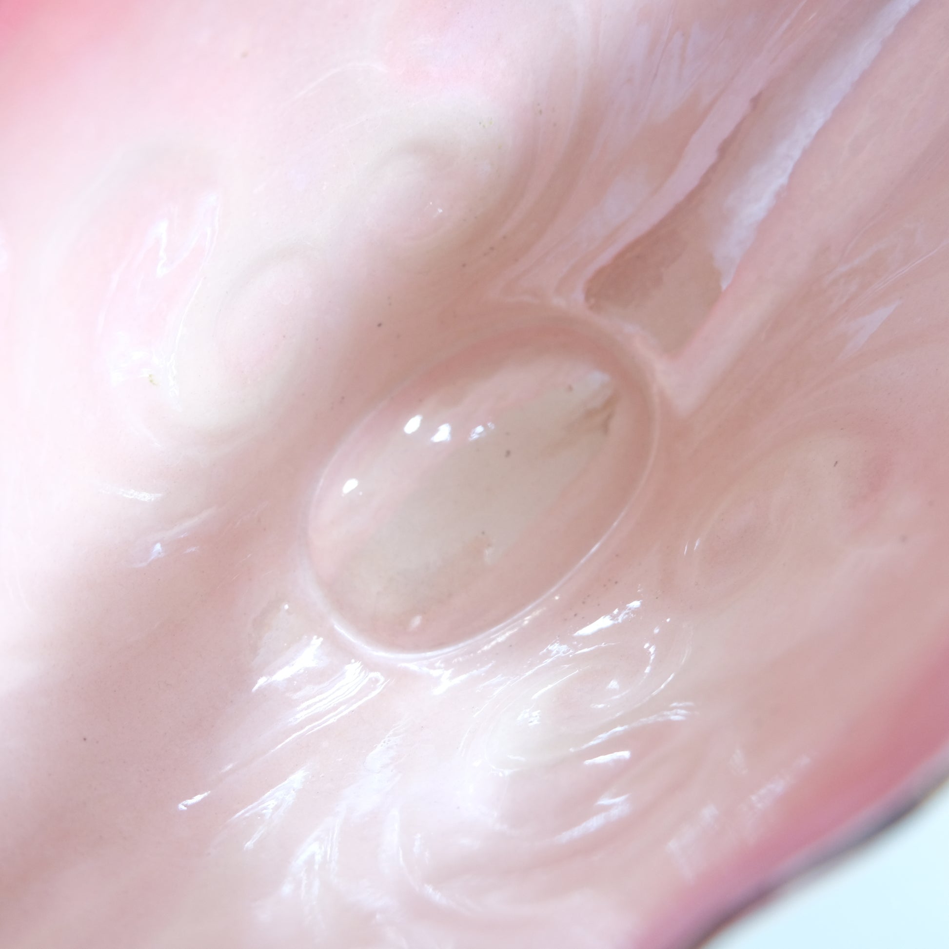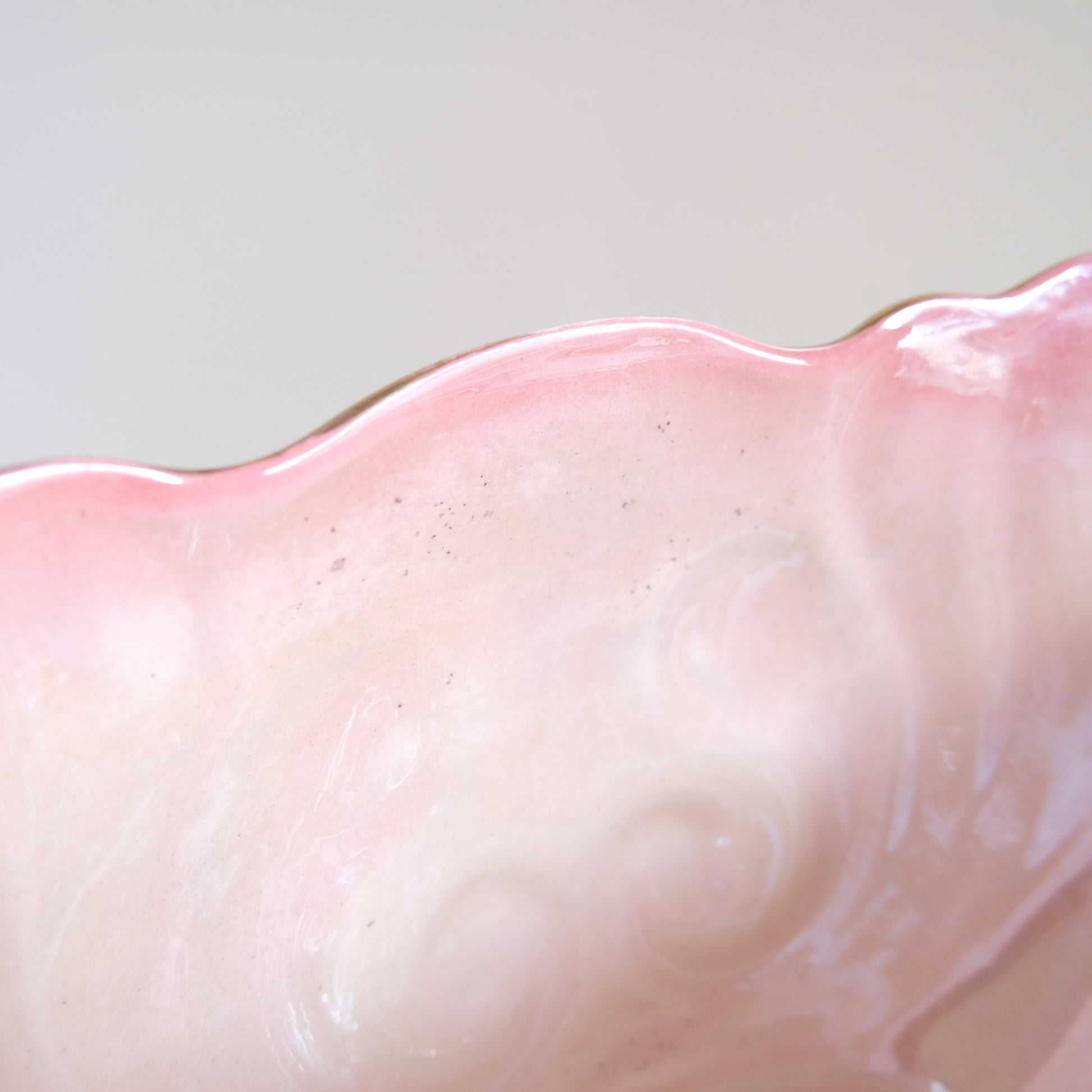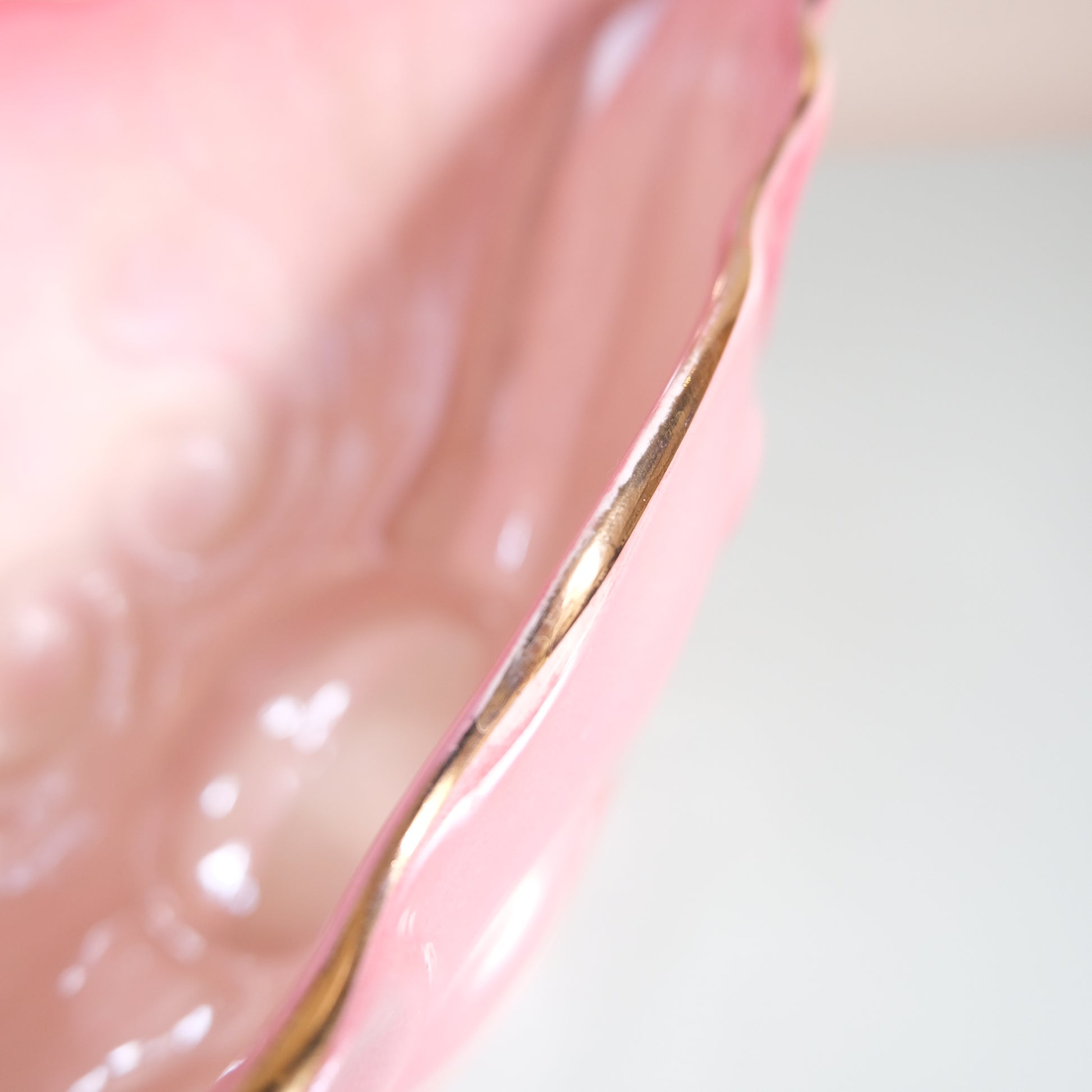 ピンクのボディに艶やかに輝く釉薬と、ゴールドの装飾がポイント。